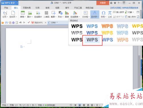 2、在打開的Wps文字程序窗口,打開插入菜單選項(xiàng)卡,點(diǎn)擊藝術(shù)字選項(xiàng),在彈出的選項(xiàng)框中,選中一個(gè)藝術(shù)字樣式。如圖所示;