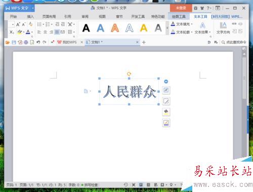 3、在wps編輯區(qū)域,插入藝術(shù)字輸入框,并輸入文字內(nèi)容。如圖所示;