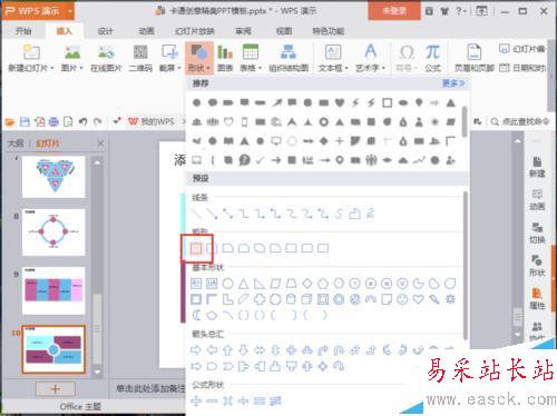 3、在插入菜單選項卡下,依次點擊“形狀”-->“矩形”選項按鈕。如圖所示;