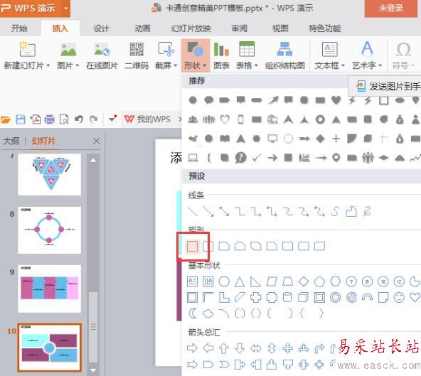4、矩形圖形選擇好以后,在最后一張幻燈片中畫出圖形。如圖所示;