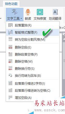 先用Ctrl+A全選文字,然后執(zhí)行“文字工具”下的“智能格式整理”