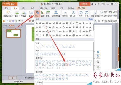 4、在打開的插入菜單選項卡下,依次點擊“形狀”-->“同心圓”圖形。如圖所示;