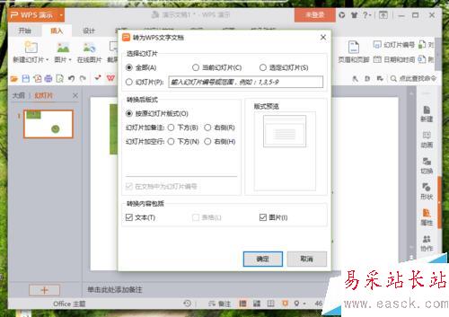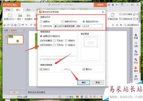 4、在轉為WPS文字文檔對話框中,修改“選擇幻燈片、轉換后版式、轉換內容包括”選項,再點擊“確定”按鈕。如圖所示;