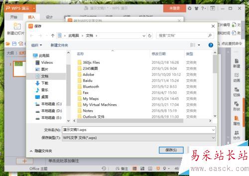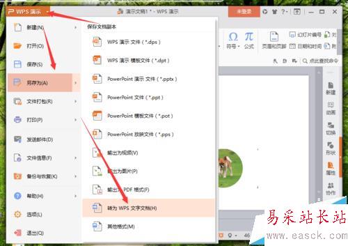 2、在打開的Wps文稿窗口,依次點擊“Wps演示”-->“另存為”-->“轉為WPS文字文檔”選項。如圖所示;