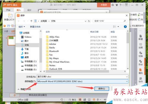 6、在保存對話框中,將保存類型更改為“Microsoft Word 97/2000/xp/2003 文件(*.doc)”選項,再點擊“保存”按鈕。如圖所示;