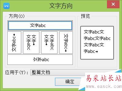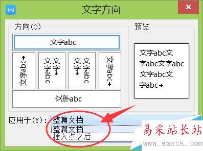 注意:文字方向在設置時,默認是整篇文檔都會改變方法。不過在“文字方向”的對話框里(如下圖所示),可以設置文字方向是“整篇文檔”還是“所選文字”。