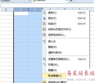 4、這里的話,我們就是需要選定 D 列 和 F 列,然后右鍵菜單,選擇“取消隱藏”即可。