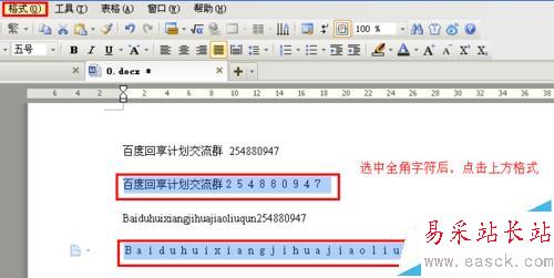 1、在文檔中選中需要轉(zhuǎn)換的全角字符,然后點擊上方菜單“格式”。