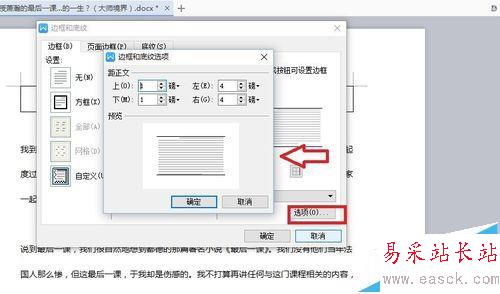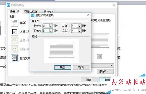 5、在彈出的“邊框和底紋選項”對話框中設(shè)置好邊框距離正文的距離,連選單擊2次“確定”按鈕。