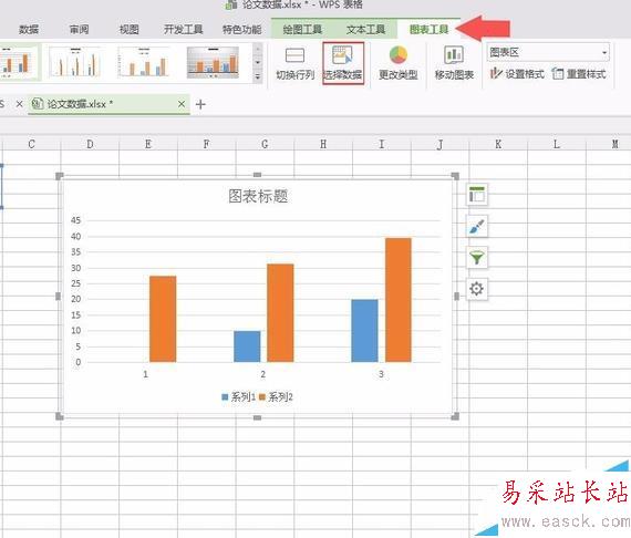 3、出現(xiàn)柱形圖的一個(gè)基本模式后,然后需要我們輸入數(shù)據(jù),將柱形圖變成我們想要的。點(diǎn)擊柱形圖的空白處,在工具欄處出現(xiàn)”圖表工具”,點(diǎn)擊”選擇數(shù)據(jù)”,出現(xiàn)一個(gè)編輯框。將編輯框最上面一欄“圖表數(shù)據(jù)區(qū)域”后面的空格清空,將鼠標(biāo)點(diǎn)擊空格處,然后將Y軸數(shù)據(jù)全選,這樣Y軸的數(shù)據(jù)就輸入到了空格里。
