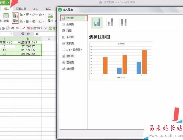 2、選中所有的數(shù)據(jù),然后點(diǎn)擊”插入”→”圖表”,選擇”柱形圖”,點(diǎn)擊”確認(rèn)”。