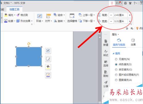 4、繪制一個任意大小的矩形,并在繪圖工具欄的右側按照第2步中記錄好的數據調整矩形的大小,如下圖所示。
