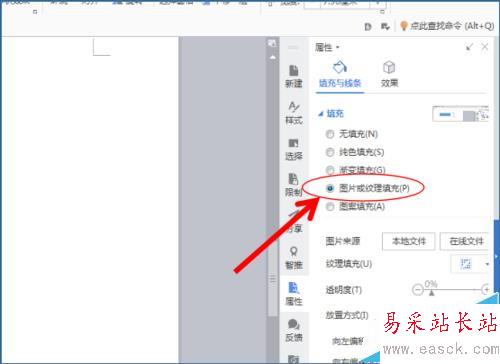 5、在界面右側的屬性欄中,展開填充,并選擇 圖片或紋理填充 ,如圖所示。