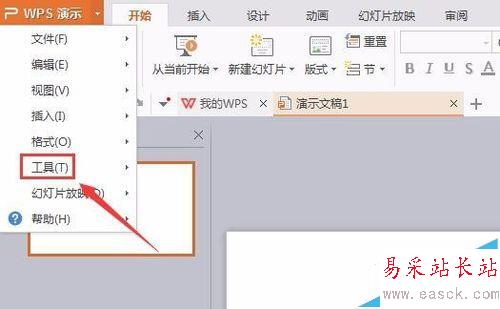3、點擊WPS演示后的三角箭頭,進入自己菜單欄,在自己菜單欄里找到工具選項,如圖所示: