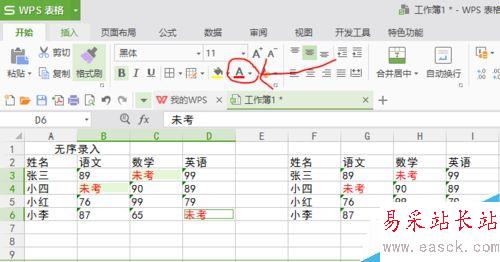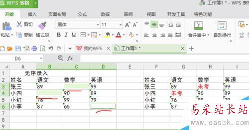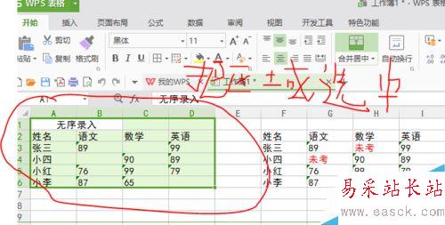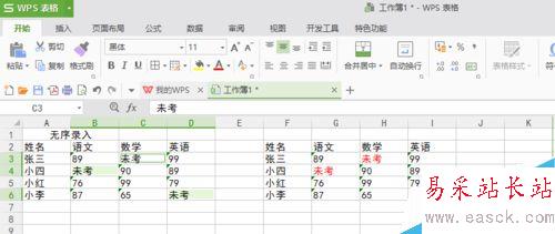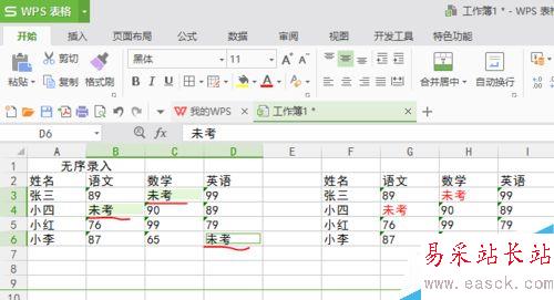 無序錄入就是沒有順序的,比如說我們現在想把這個表里面空白的地方做成像旁邊那個表格一樣都寫未考(如下圖),方法有很多,但我認為最快的方法是這樣做的,接下來看一下。