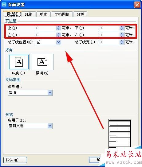 2、點擊“頁面布局”,再點擊菜單框右下角的小箭頭,打開“頁面設置”對話框。在“頁面設置”對話框中把“頁邊距”都設置為零,并點擊確定。