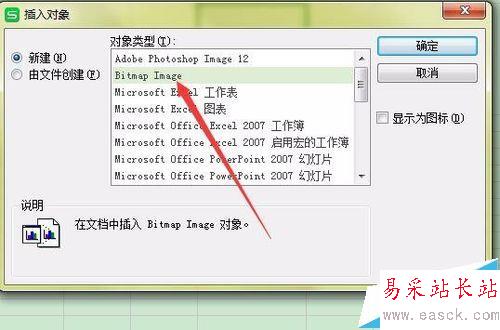 2、在彈出來的插入對象對話框選擇位圖,可能版本不一樣出現的效果也不一樣,沒有關系,只要選擇插入的對象格式是圖片就可以了。