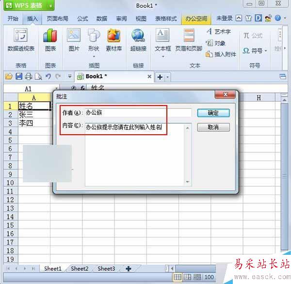 這時會彈出批注對話框,我們可以輸入作者,以及批注的內容,告訴大家你想表達的意思。