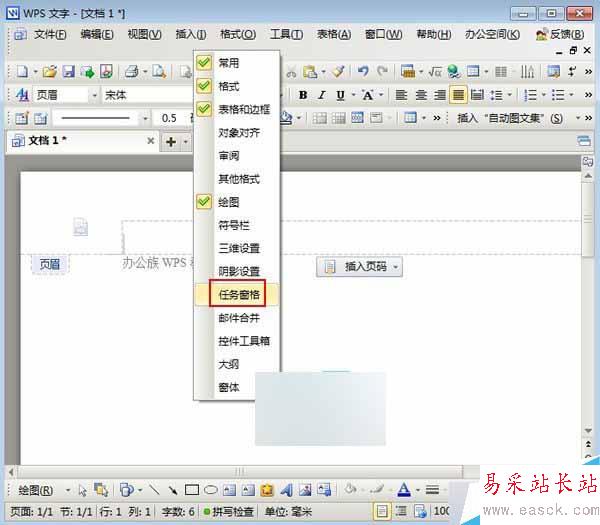 光標點擊頁眉或者頁腳處,然后右擊菜單欄空白處,選擇任務窗格。