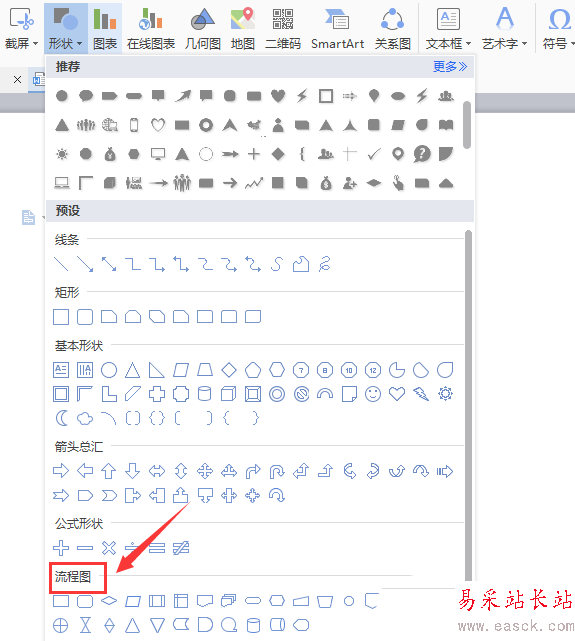 4、點擊形狀選項,在其子級菜單里找到流程圖選項,如圖所示: