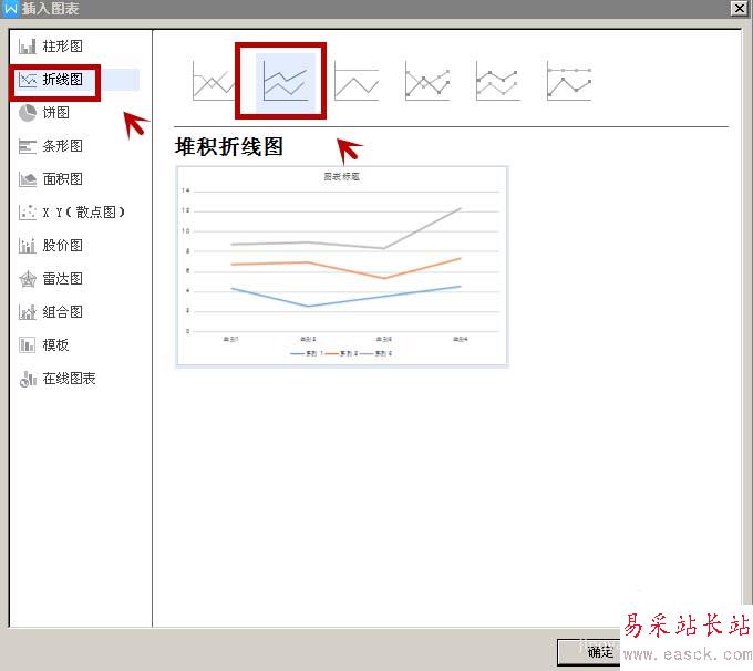 5、在插入圖表框中單擊折線圖,在這里折線的圖樣很多,選擇第二個圖樣為例,單擊確定。
