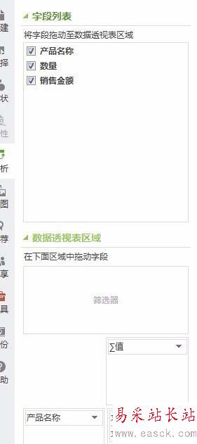 5、右邊將字段拖動至數(shù)據(jù)透視表區(qū)域(打上勾也可以) 產(chǎn)品名稱放到行的位置,數(shù)值放到值的位置