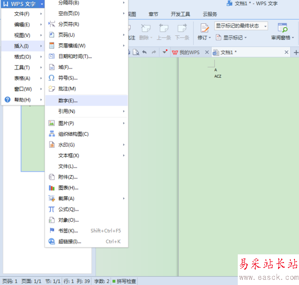 6、1---代表 A。780---代表ACZ。我們也可以選擇點擊WPS文字下面的插入,再點擊數字,也可以打開對話框。