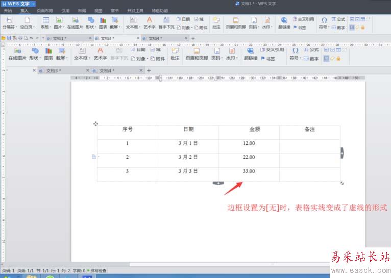 6、[邊框和底紋]中設(shè)置為[無]時,表格的實線變成了虛線,如下圖所示。