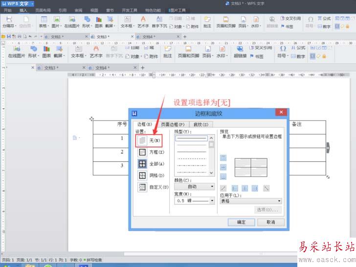 5、先我們要把現(xiàn)有表格默認的表格線設(shè)置為無邊框的樣式,按下圖所示,將[邊框和底紋]中的[設(shè)置]選項中設(shè)置為[無]。