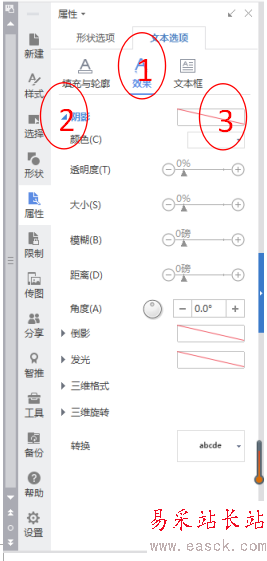5、選中文本,在右邊的選本選項里單擊“效果”,然后單擊“陰影”,選擇需要類型,這時浮雕的雛形就已經出來了。