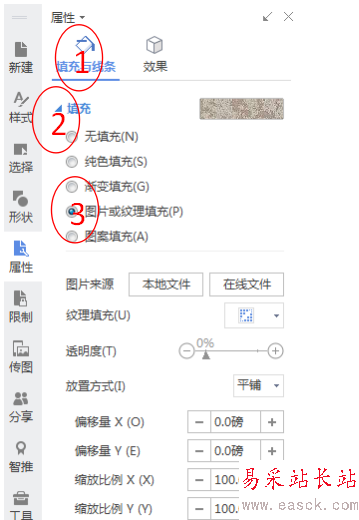 2、修改圖形屬性。在右邊的屬性框內,單擊“選擇與填充”,單擊“填充”,選擇“圖片 或紋理填充”(圖案填充也可以)。