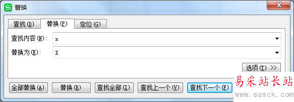 2、統(tǒng)一身份證號(hào)碼中X。選中一列身份證號(hào)碼,鍵盤(pán)上按Ctrl+F鍵,在替換選項(xiàng)里查找內(nèi)容中填寫(xiě)小寫(xiě)“x”,替換為填寫(xiě)大寫(xiě)“X”,點(diǎn)擊全部替換按鈕。