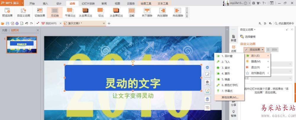 3、在“自定義動畫”任務窗格中,依次點擊“添加效果”下拉菜單——“進入”菜單項——“其他效果”二級菜單項。