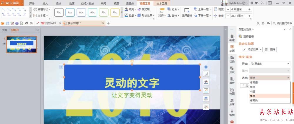 7、繼續在“自定義動畫”任務窗格中,點擊“速度”右側的下拉箭頭,在彈出菜單中選擇一個需要的速度。