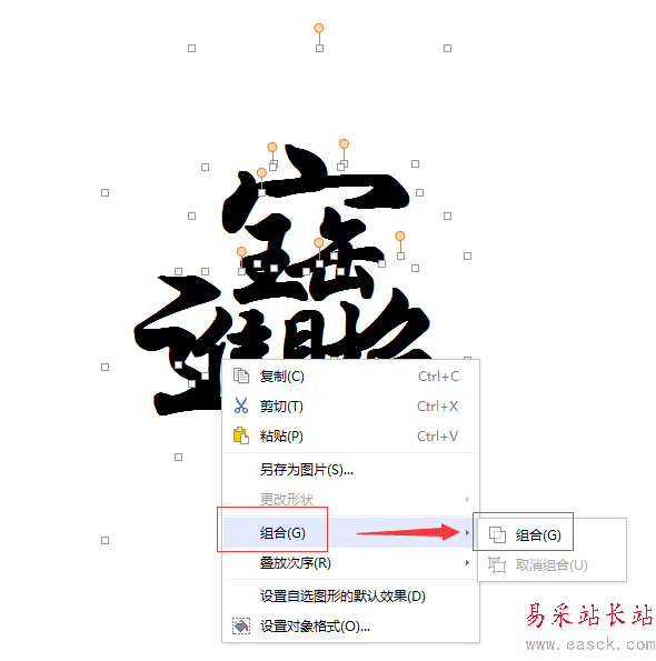 8、把偏旁都設置好之后,把字體偏旁用鼠標調整到一起組成文字,然后按住CTRL+鼠標左鍵,選中所有的圖片--右鍵--組合。)