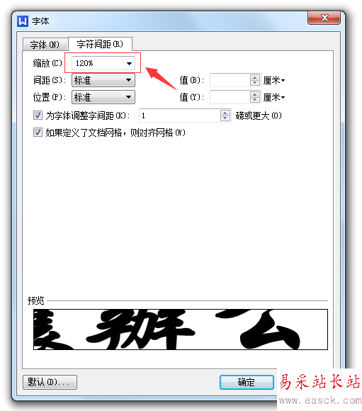 7、“辶”因為位置和長度需要的關系,需要做一下特殊的設置。首先,把“辶”字字號設置成150,然后右鍵--字體--字符間距--縮放中,修改至“120%”(在實際的制作適當再調整,此為參考值)