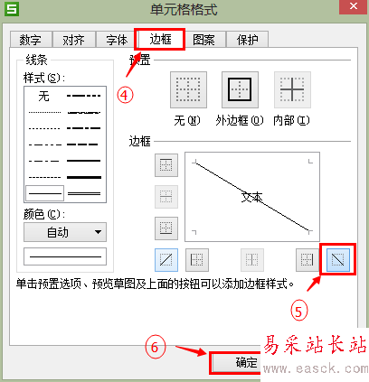 3、在單元格界面里,選擇邊框設置,點擊有斜線標志的表格,然后確定,斜線在單元格中制作出來了。