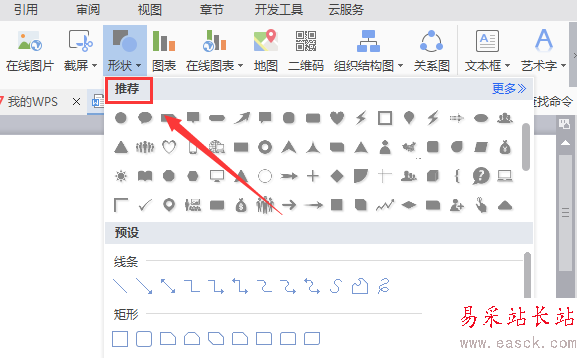 4、點擊形狀選項,在其子級菜單里找到推薦選項,如圖所示: