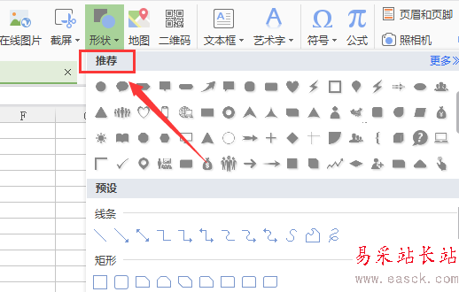 4、點擊形狀選項,在其子級菜單里找到推薦選項,如圖所示: