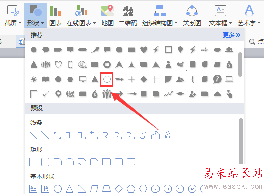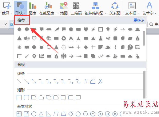 4、點擊形狀選項,在其子級菜單里找到推薦選項,如圖所示: