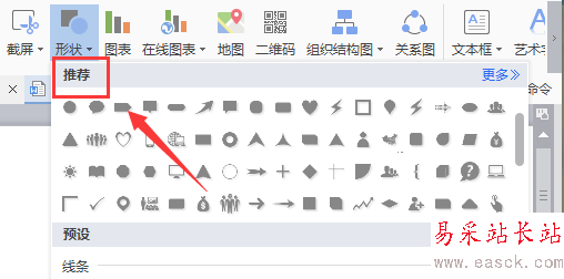 4、點(diǎn)擊形狀選項(xiàng),在其子級(jí)菜單里找到推薦選項(xiàng),如圖所示: