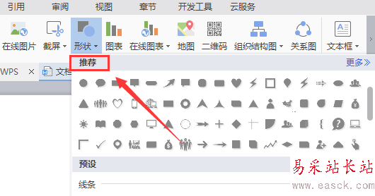 4、點擊形狀選項,在其子級菜單里找到推薦選項,如圖所示:
