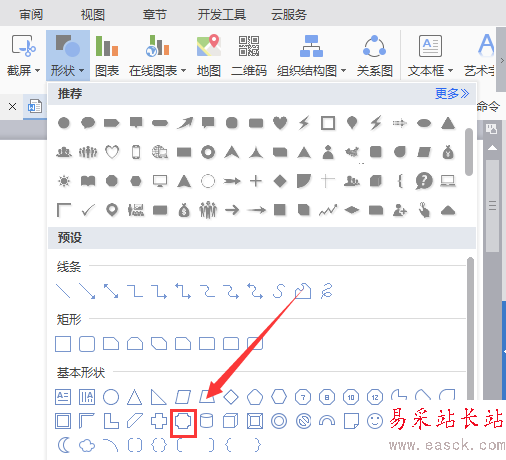4、點(diǎn)擊形狀選項(xiàng),在其子級菜單里找到基本形狀選項(xiàng),如圖所示: