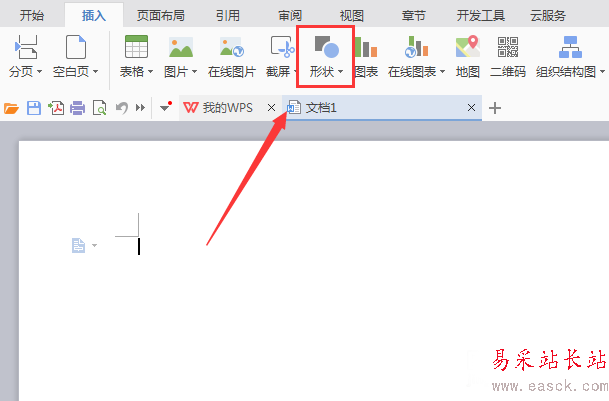 3、點(diǎn)擊插入選項(xiàng),在其編輯工具區(qū)里找到形狀選項(xiàng),如圖所示:
