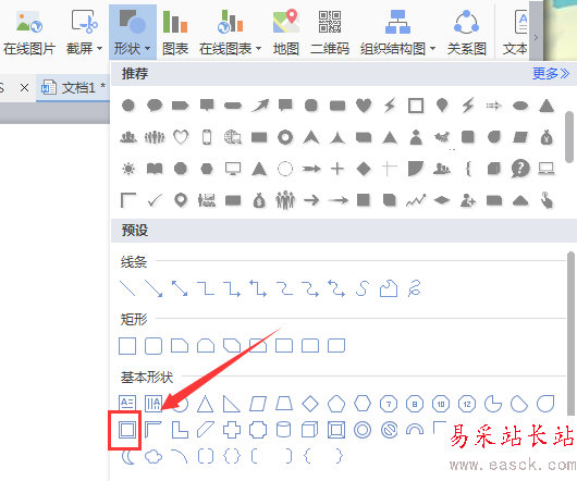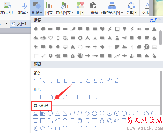 4、點擊形狀選項,在其子級菜單里找到基本形狀選項,如圖所示: