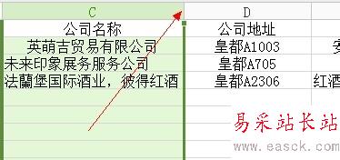3、接下來鼠標移動到首行ABC之間的交界處,鼠標會變一下符號,如下圖所示箭頭所指之處,然后按住不動,拖動鼠標左右移動
