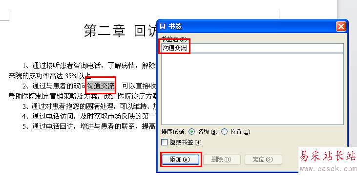4、輸入書簽名稱(根據(jù)自己的習(xí)慣和文字相同或不同都可以)點(diǎn)擊添加完成書簽的標(biāo)記。