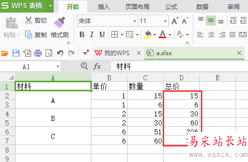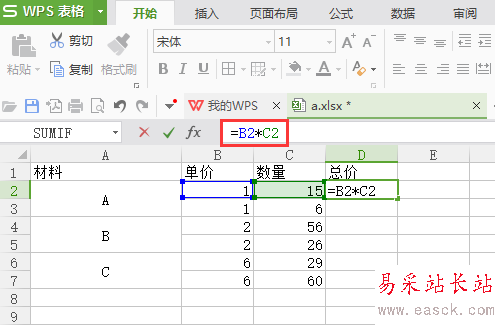 5、在D2輸入公式 =B2*C2,計(jì)算結(jié)果