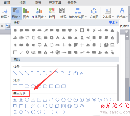 4、點擊形狀選項,在其子級菜單里找到基本形狀選項,如圖所示: