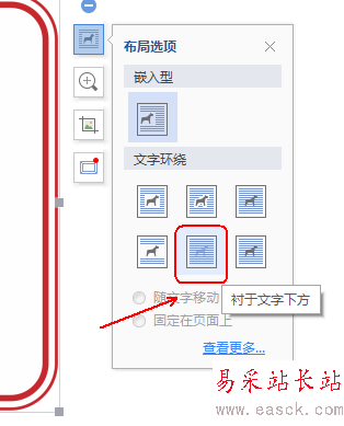 3、點擊文檔中圖片,在其右側的屬性框中選擇“布局選項”-“襯于文字的下方”